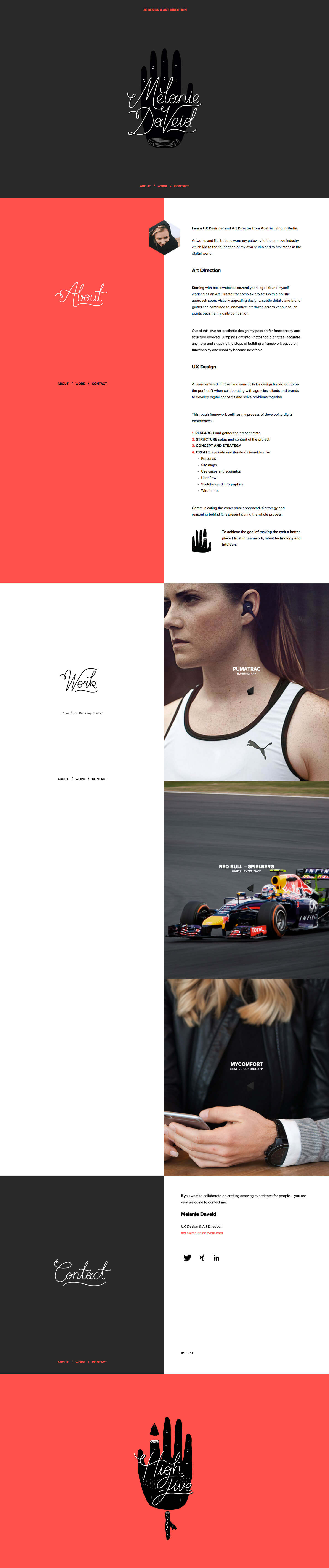 Melanie’s idea to serve a one-page layout with a seamless integration of her work faced us with the challenge to preserve access to other projects while viewing a project case study in detail. After sketching different ideas and prototyping the most feasible ones we finally came up with an approach to inject project case studies without loosing the red line and preserve the overall simplicity of the site. We spend a lot of time finding the best workflow and transitions to switch the interface from a list of projects to the view of a single case study and vice versa.